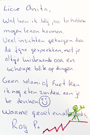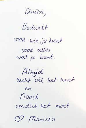 Toch heb ik mijn weg gevonden. Door te vallen, op te staan, door te leren omgaan met wat er is. Deze ervaring heeft me veerkrachtig gemaakt en leren relativeren. Ik heb geleerd dat het leven niet altijd maakbaar is, maar dat we wél invloed hebben op hoe we ermee omgaan. Erkenning geven aan wat je hebt verloren, geeft ruimte om opnieuw te bouwen. Delen is helend. Soms begint doorgaan bij stilstaan. “De shit van vandaag is de mest van morgen. Je moet het zelf doen, maar niet alleen.” Een zin die me al jaren dierbaar is.
